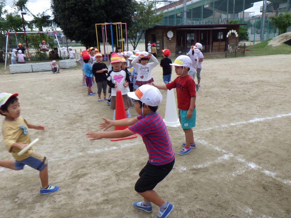 「リレー大好き!」年長さんに憧れてリレーごっこを繰り返し楽しみました