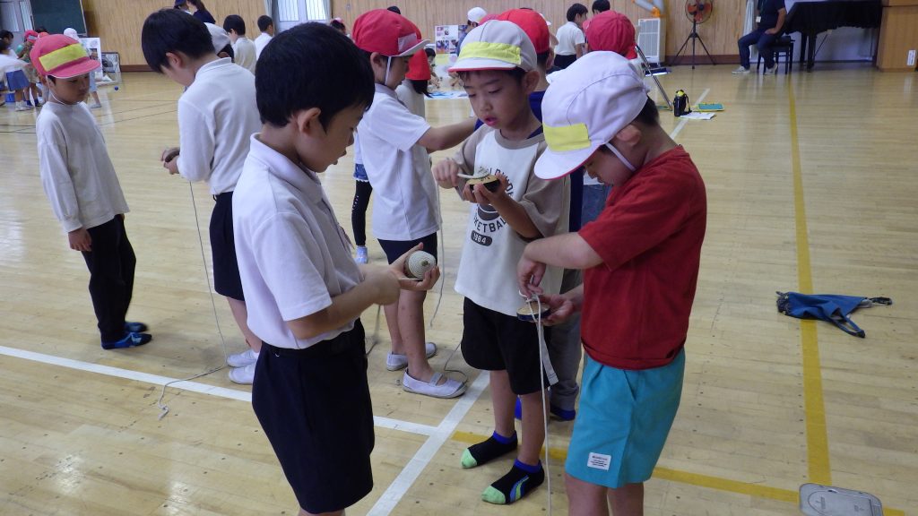 附属平野小学校の1年生のおにいさん、おねえさんと一緒に、昔遊びをして遊んだよ