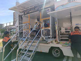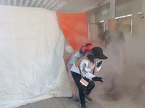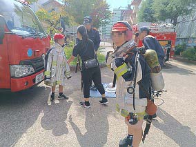 天気はばっちり晴れて暑いぐらい。熱中症にも気を付けながら、煙幕体験、避難所体験、水消火器体験、バケツリレー、起震車体験、消防車体験。どれもいい体験になりました。
