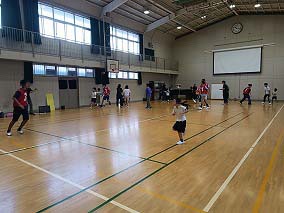 前半は体育館で鬼ごっこ。中学部の生徒が鬼役になり、小学部の児童は捕まらないように逃げる。2回目は小学部の児童の一部も鬼役になり、お友達を追いかけました。