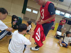 附属幼稚園からお声がけをいただき、小学部1くみが附属幼稚園で行われたすもう会に参加しました。初めて出会ったお相撲さんは大きくて、怖いと言っている子もいましたが、幼稚園のお友だちがお相撲さんに向かって力強く立ち向かっているのを見て勇気をもらったのか、支援学校の番になったら、皆果敢にお相撲さんに向かっていました。取組中にお相撲さんとクルクル回ったり、抱きかかえられたりと笑顔いっぱいの取り組みでした。相撲後は最初の恐怖心もなくなり、お相撲さんを探しては積極的に関わっていました。突然のお誘いでしたが、子どもたちにとっていい経験となった交流でした。