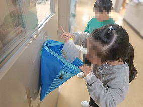 大きな風船を見ると、「おおきぃ!」と驚いた表情で、早くしたくて、目がきらきら。大きな風船でも一人でトスしたり、クラスのお友達とトスをしたり、できるだけ落とさずに協力しながら頑張っています。