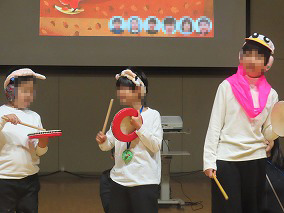 今年の小学部のテーマは「ひらーのんのおんかくか」。「山の音楽家」をモチーフに音楽の授業で取り組んでいることの発表会形式にしました。身につけている衣装は図工でつくったもの、最後のフィーナーレは運動1の授業中に体操代わりに取り組んだものなど、普段授業でしていることの発表の場となりました。