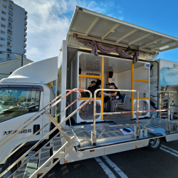 ご挨拶のあと、校内施設を見学しました。生活訓練棟では高等部の授業を見学。高等部生徒の皆さんがはりきって演奏・演舞すると、見学者の皆さんもただ見ているだけでなく一緒に声を出したり踊ったりして活動を楽しんでくれました。そのあと避難訓練の様子を見学した際には、防火・防災訓練や防犯訓練を定期的に実施していることや、児童生徒のすばらしい避難の様子(特に、どの児童生徒も静かに落ち着いて行動していること)に驚かれていました。