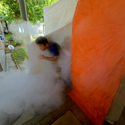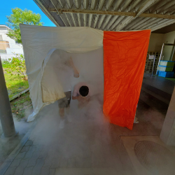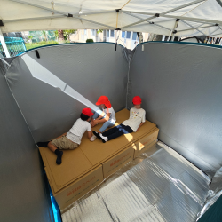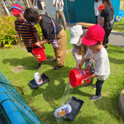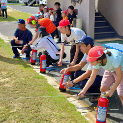 引き続き、防火・防災学習の開会式が行われたあと、小学部・中学部・高等部がそれぞれのグループに分かれて、保護者の皆様と一緒に「消防車(消防士)体験」「避難所体験」「救急救命講習(高等部のみ)」「バケツリレーと水消火器による消火体験」「煙道体験」「起震車体験」など様々な体験学習に取り組みました。