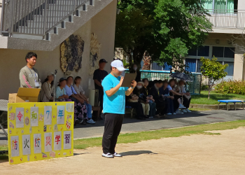 先日の始業式にて、2学期の大きな目標として「いのちを守る」というお話を児童生徒に向けてしました。本日行われた火災避難訓練もその一環です。木工室から出火という設定で、各学部の児童生徒は第一次避難場所まで「おはしも(押さない、走らない、しゃべらない、戻らない」を守って避難できていました。2025.9.5