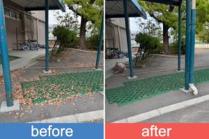 PTAサークル「インドアサークル」では、入学式を目前に控えたこの時期、体育館まわりの清掃として落ち葉掃除を行いました。