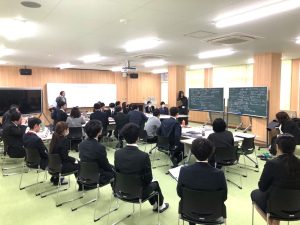 午前中にご来校いただいて,本校の今年度の研究概要をご説明した後,午前と午後に1時間ずつ未来探究科の研究授業をご参観いただきました.そして,授業後の討議会において本校の研究,授業についてご講評いただきました.