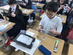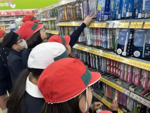 子どもたちは自分なりに色々と考えて、「これを買おう」という商品を選んで、先日、買い物にでかけました。「先生、思った以上に他に商品がいっぱいある!選びなおしていいですか。」「お家の人にも買ってあげたい。歯にいいものを選びたい。」「思ってたものが買えてよかった!早速使ってみる。」等々、買い物中にも色々な感想が出ていました。歯ブラシの買い物を通して、子どもたちは「消費活動」の難しさや大切さを感じたのではないかと思います。