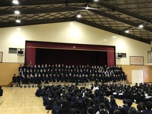 それぞれの学年から気持ちのこもった歌や言葉がプレゼントされると、6年生からは自然と拍手が起こっていました。6年生からもプレゼントへのお礼が伝えられ、お返しの歌のプレゼントがありました。
