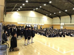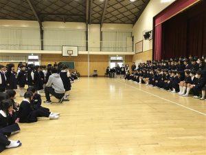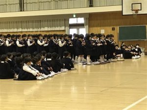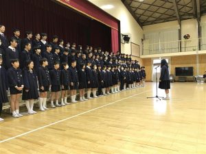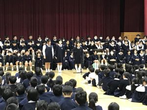 それぞれの学年から気持ちのこもった歌や言葉がプレゼントされると、6年生からは自然と拍手が起こっていました。6年生からもプレゼントへのお礼が伝えられ、お返しの歌のプレゼントがありました。