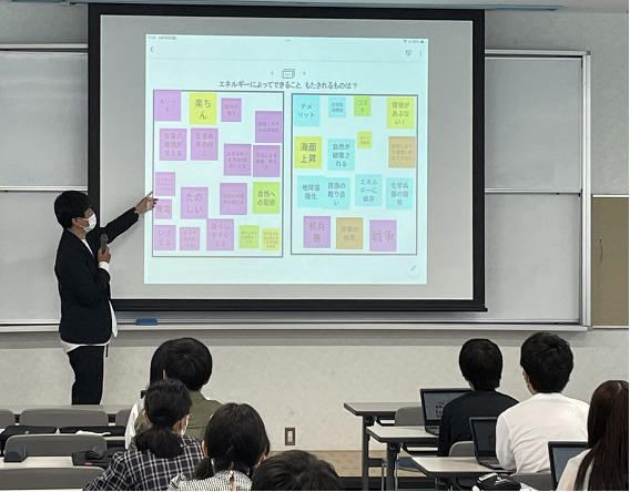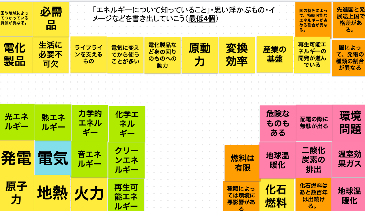 Google Jamboardを使用し、お互いの知っているエネルギーについて分類しました。活動を通じて、わたしたちの生活や人類の発展とエネルギーは切っても切り離せないものだということに、生徒は気づいたようです。