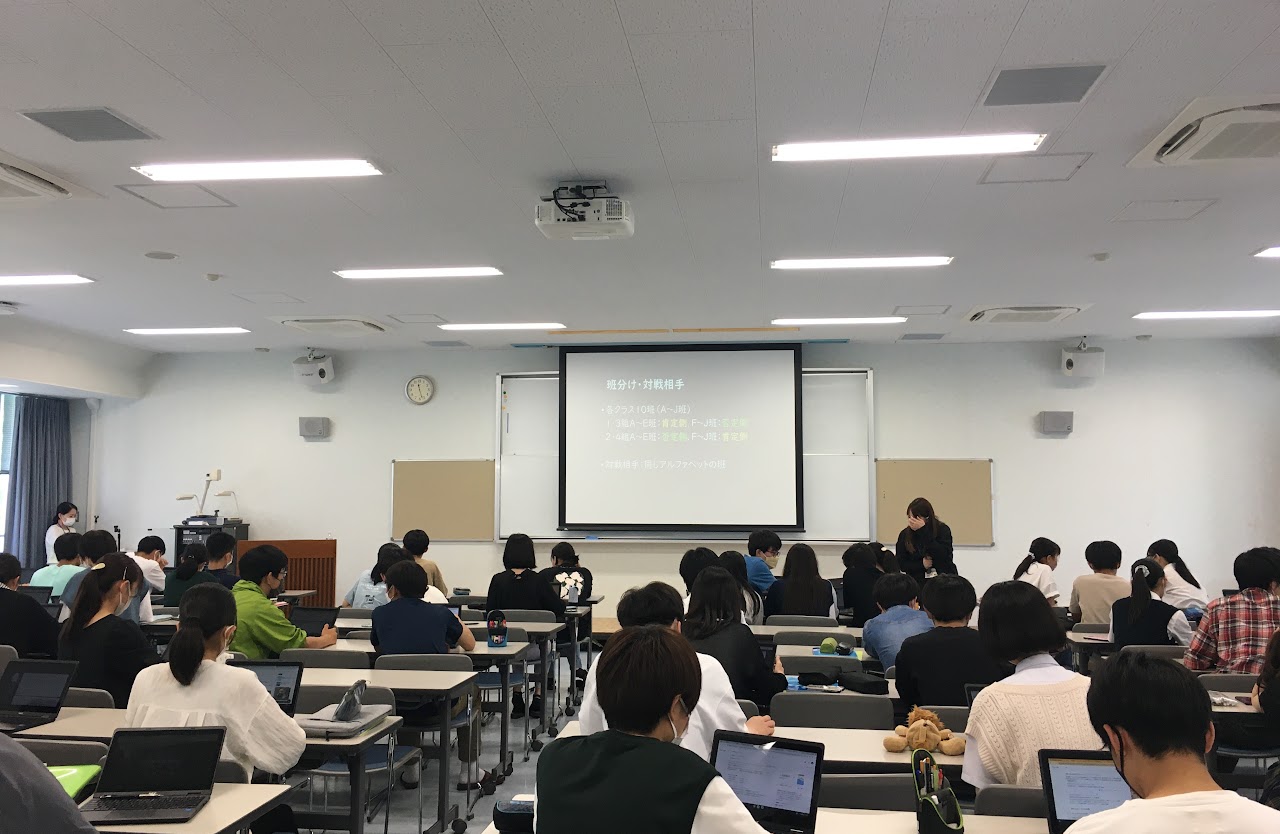 まず先生の実演を見た後,自チーム内での役割分担と、対戦相手チームと司会などの役割分担をおこないました。
