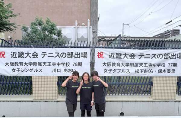 女子テニス部では,3年ぶりに近畿大会へ出場することができました。近畿大会出場を祝して本校正門付近に横断幕が設置されました。