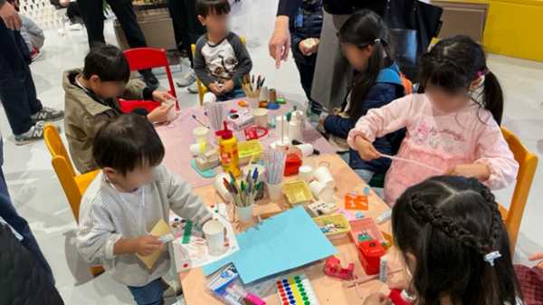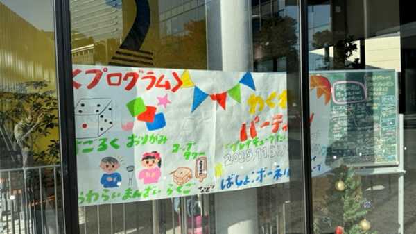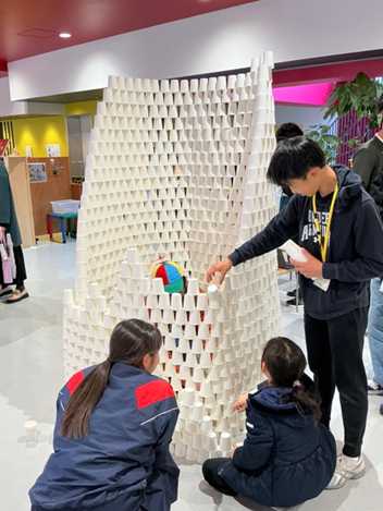 当日は、ボーネルンド社のフリースクール「PLAY CUBE」を会場に、大学生によるすごろくや小学生の折り紙のお店に混じって、本校生徒が企画した紙コップを用いた造形遊びや工作、謎解きゲームコーナーを開いて来場者に楽しんでいただきました。