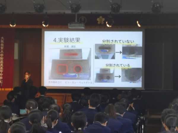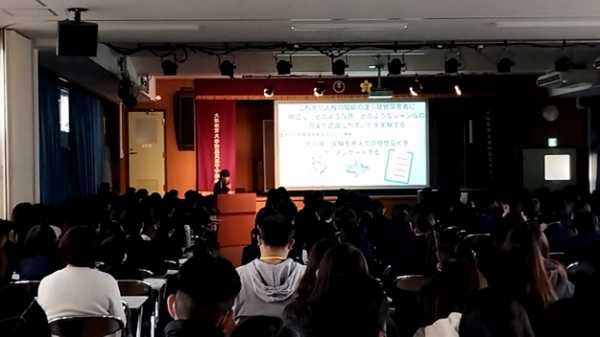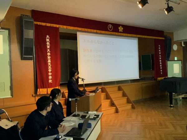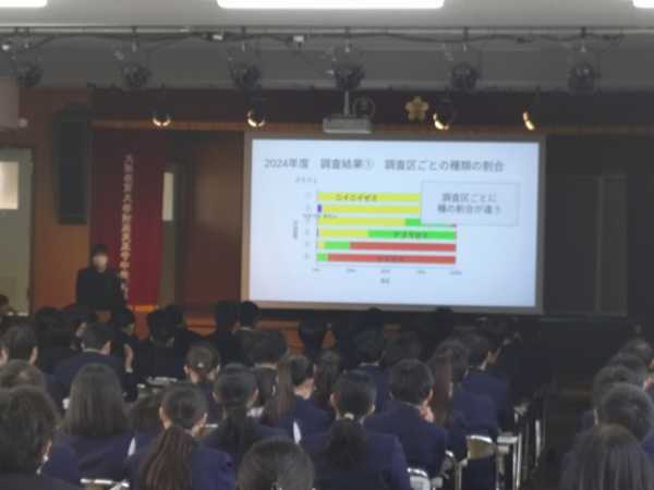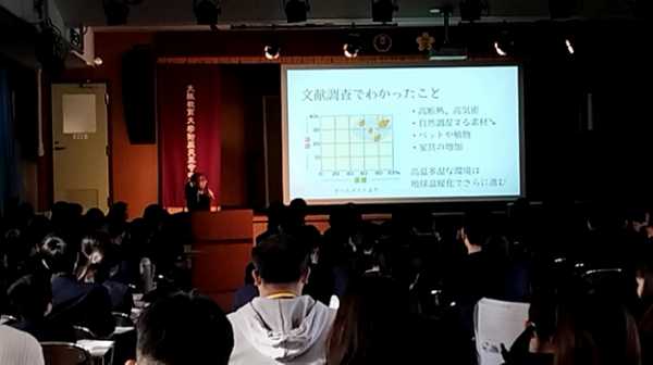 この日は学級から選出された8名が学年生徒・保護者・外部一般公開者に向けて研究発表を行いました。発表者の持ち時間は、発表(7分)・質疑応答(2分)です。発表では、学年代表として相応しい研究内容でした。質疑応答では、新たな視点を与えるような質問がいくつか見受けられ、それらに対して堂々と返答する発表者の姿が印象的でした。