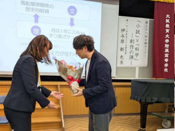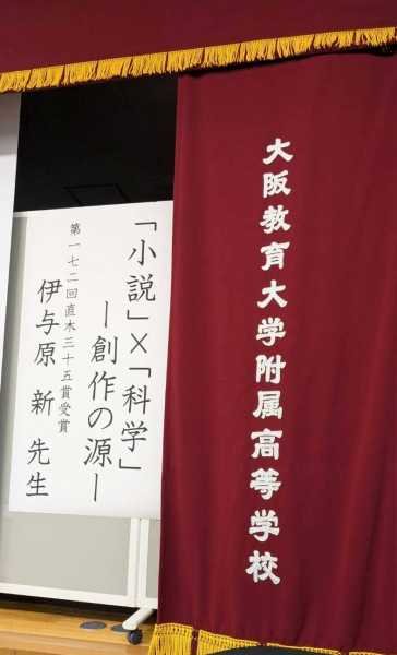 伊与原先生は、本校卒業後、神戸大学、東京大学大学院で地球惑星科学を専攻。研究者から小説家に転身されたという異色の経歴をお持ちで、「藍を継ぐ海」で直木賞を受賞され、ドラマ化された「宙わたる教室」は高校生の読書感想文の課題図書にも選ばれました。「宙わたる教室2」がこれから放送予定で、今後は執筆活動に専念される予定のため、この講演は大変貴重な機会となりました。